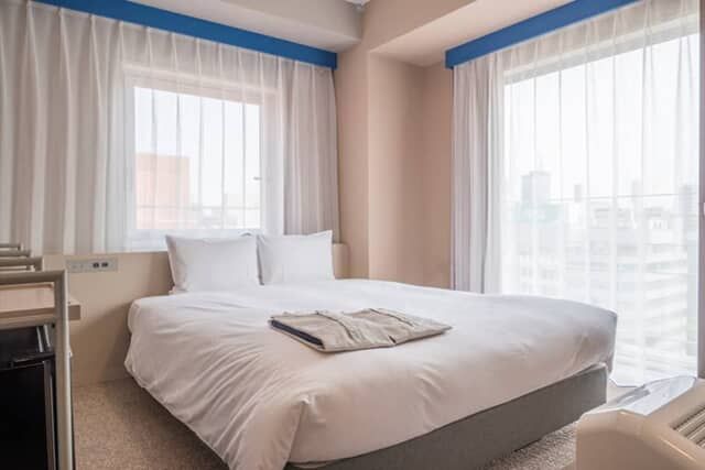 16.5平米とコンパクトな角部屋ながら、ベッドサイドは街の風景を見渡せるワイドビューの広い窓で、開放感のある間取りです。シモンズのダブルベッドは幅160cm。2名利用でもゆったりと寝られます。