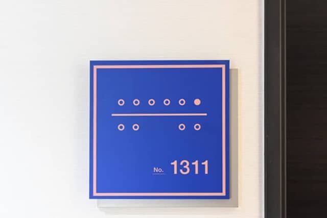 ルームサインのストライプは客室フロアの廊下を示していて、○が各客室の位置、●が1311号室を示すパズルのようなデザインです。もちろん客室ごとに●の位置が変わります。