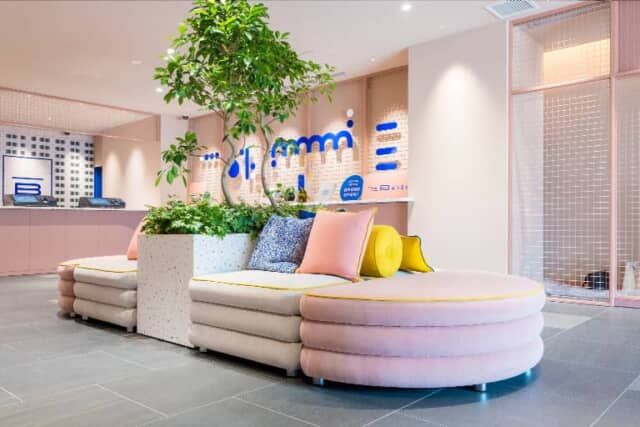 ▲ロビーはコンセプトカラーのダスティピンクとロイヤルブルーが印象的