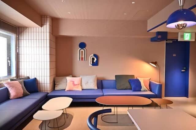 柔らかなフォルムのソファやカラフルなクッションがあるほか、金網が張られたロッカーも遊び心を感じます。チェックインは写真左奥のフロントで行い、支払いはキャッシュレスのみ。クレジットカードやQR決済、交通系ICなどが利用できます。