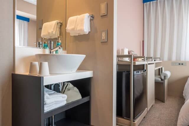 「小さな満足」をコンセプトにした客室は、31平米のユニバーサルルームを除き、すべての客室が15.5平米から16.5平米ほどの広さ。1 Bed Room や2 Beds Room のほか、窓を広くとった1 Bed Room w/wide view(ワンベッドルーム ウィズ ワイドビュー)や、可愛らしいソファを置いた2 Beds Room w/sofa(ツーベッドルーム ウィズ ソファ)など5タイプ119室をそろえます。バスとトイレは独立タイプ。全室に40型テレビを備え、シモンズ社のベッドも満足感を高めます。