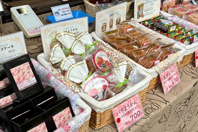 園内で展開されている「ローズガーデンマーケット」では、バラにちなんだ雑貨やスイーツが並んでいます。