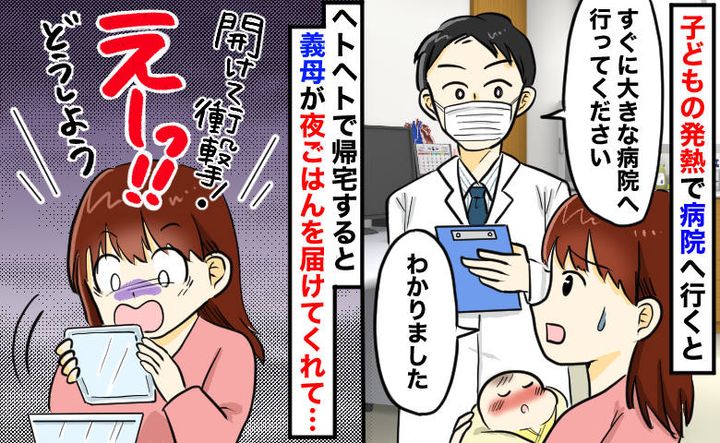 義両親は近所に住んでいて、義母が食事を差し入れてくれることもあり、とても助かっていました。ある日の夕方、息子が発熱して近所の小児科から紹介された大きな病院で診てもらうことに。私の体調も万全ではなく、さらに夫の帰宅も予定より遅くなるというバタバタな日がありました。そんな状況を知った義母が食事の差し入れを持ってきてくれたのです。