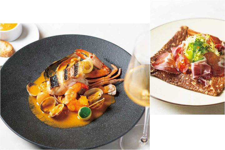 〈左〉ポアレした黒鯛にワタリガニ、海老やムール貝といった具材と濃厚なスープを別仕立てにして、それぞれの味わいを堪能できる。ブイヤベース¥2,300〈右〉香ばしい蕎麦粉ベースの生地にサラミチョリソー、ベジョータ生ハム、コッパ、自家製ジャンボンブラン、そしてポーチドエッグをあしらった食べ応えある一皿。ガレットシャルキュトリー¥1,980