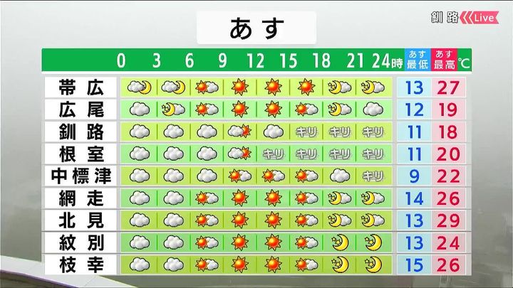 十勝やオホーツク海側は晴れて、網走26度など真夏並みの暑さになります。釧路や根室は低い雲や霧が広がります。車の運転は濃い霧による見通しの悪さにも注意して下さい。