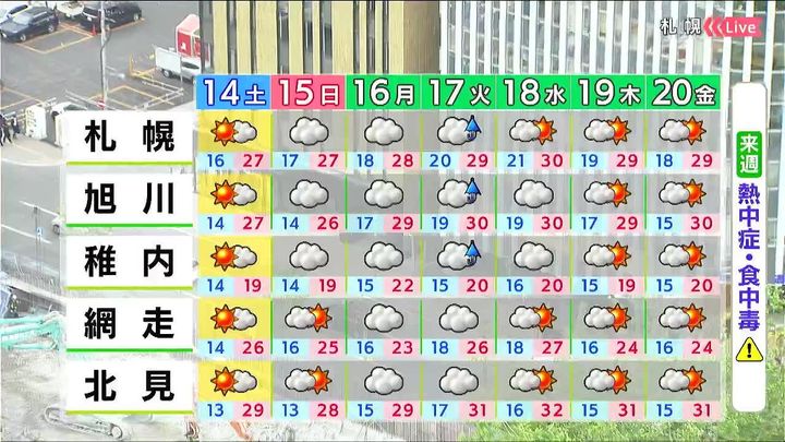 日曜日以降は雲が広がり、火曜日は日本海側で雨が降るでしょう。日ざしは少なくても内陸では30度前後まで気温が上がり、厳しい蒸し暑さになりそうです。札幌は来週水曜、今年初めて30度の真夏日になるでしょう。