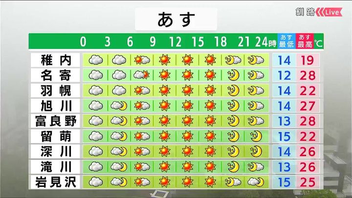 朝から各地で晴れるでしょう。稚内周辺ではあす14日(土)も風が強まります。内陸では25度以上の夏日でカラッとした暑さですが、朝晩との気温差が大きくなるため、服装選びに気を付けて下さい。