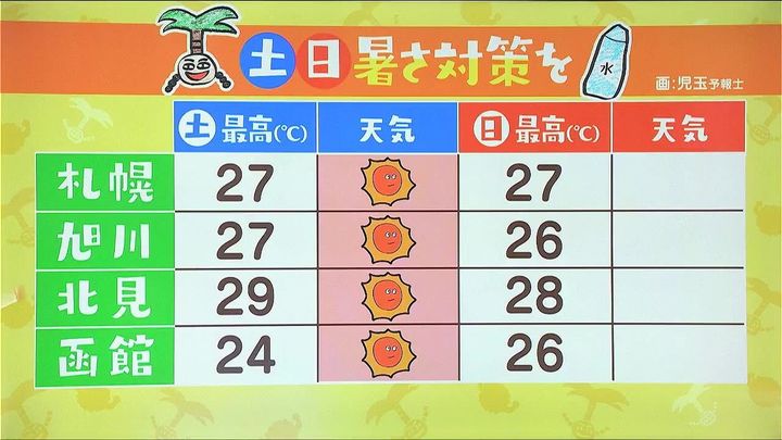 主な都市の土日の天気と最高気温です。あす14日(土)は晴れて札幌、旭川27度、北見は29度で、きょう13日(金)よりも暑さが増しそうです。日曜も土曜と同じくらいの気温ですが、天気はというと・・・