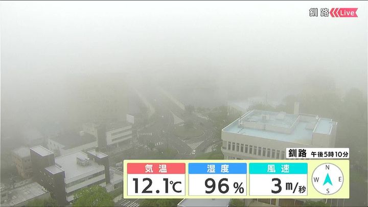 釧路では霧が濃いです。太平洋側では夏は霧の季節ですね。