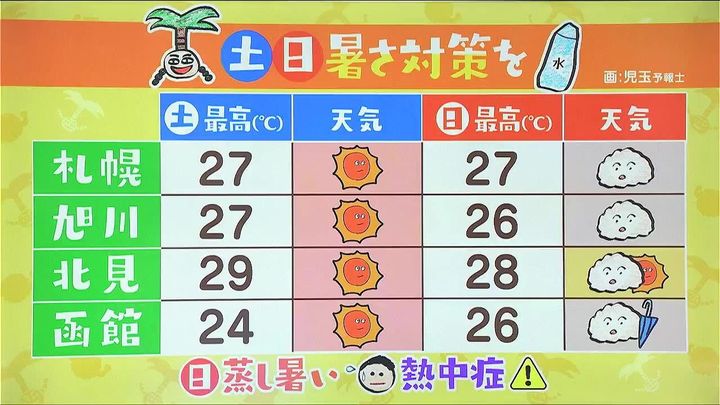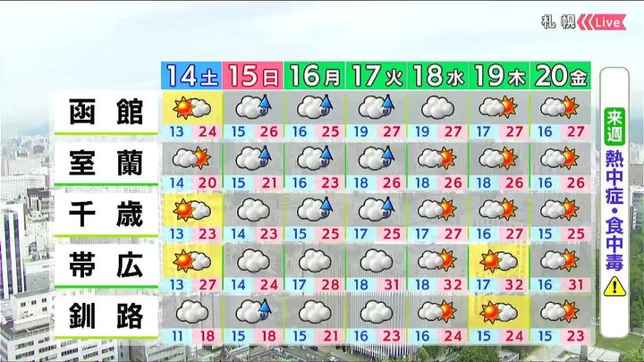 日曜は雲に覆われ、海岸部を中心に霧雨や小雨が降るでしょう。月曜も朝晩を中心に道南方面で雨が降りそうです。海岸部でも25度前後まで上がり、蒸し暑くなるため、熱中症や食中毒にも注意して下さい。