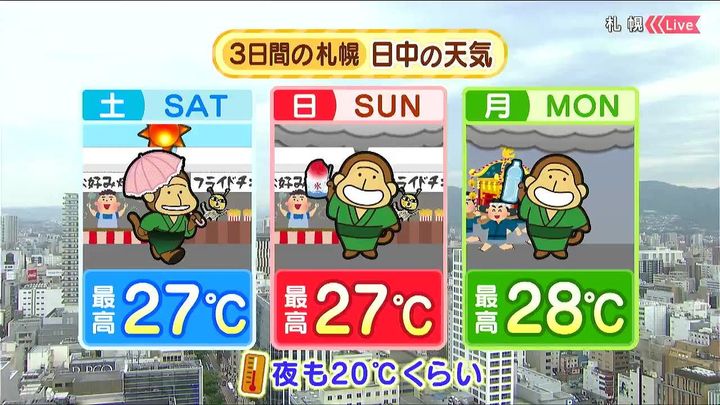 もんすけは3日とも札幌まつりを満喫してますね。天気の大きな崩れはありません。昼間は25度以上と暑く、夜も20度くらいで経過するため、浴衣でも寒くなさそうです。日傘や水も持っています。暑さ対策をしながら、楽しんでください。