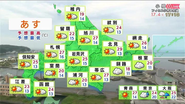 札幌や小樽は晴れて、25度以上の夏日になります。日中は半袖で過ごせます。函館や千歳も晴れて暑くなりますが、苫小牧は低い雲や霧がかかるでしょう。