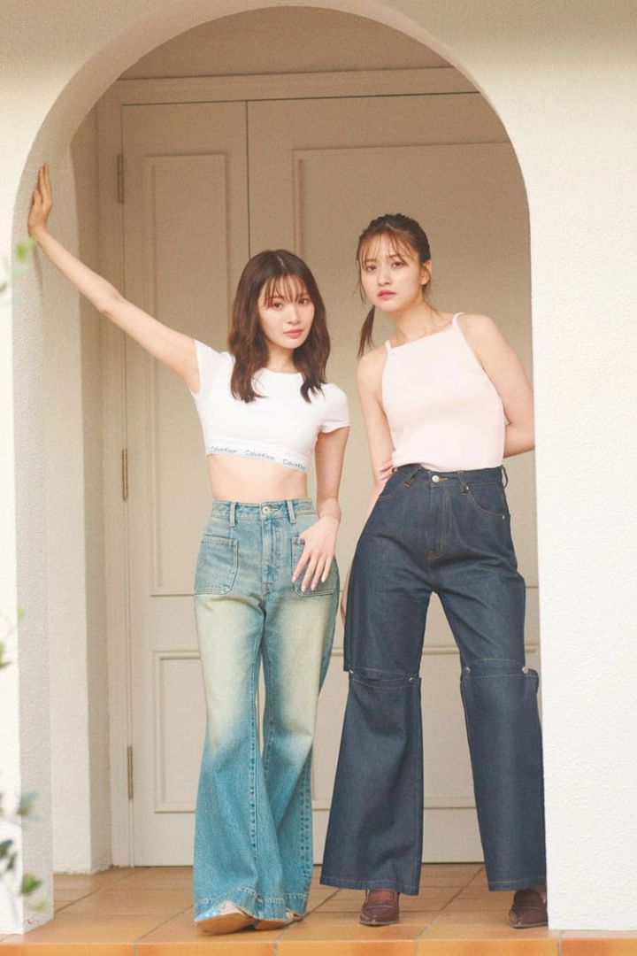 〈右・紗耶〉2WAYスリットデニムパンツ 22,000円/HONEY MI HONEY ピンクキャミソール 4,390円/ZARA(ザラ)ブラウンパンプス 13,200円/dazzlin デニムのカジュアル〈左・紅葉〉ブーツカットデニムパンツ 14,300円/rienda(バロックジャパンリミテッド)白ショート丈Tシャツ 9,900円/カルバン・クライン アンダーウェア(カルバン・クライン)パンプス 12,650円/ル タロン(ル タロン 有楽町マルイ店)