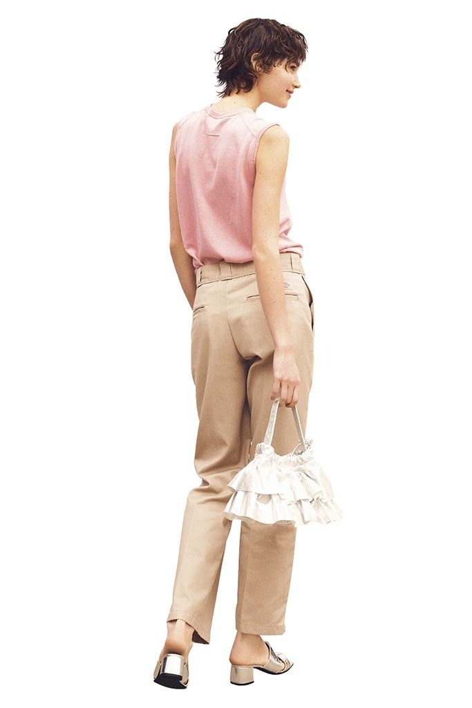 チノパンツ(メンズ)/ディッキーズ 短め・ノースリ・甘めのトップスを着るときに起用したい「メンズのチノ」。ウィメンズの形と特に違うのは腰まわりのゆったり感。特有の生地の厚みやハリと相まって体との間に余白が生まれるおかげで、むしろ華奢に見える。「チノといえば」なブランドの中でも、とくに不動の人気を誇る“874”。センタープレス入りで、シーンレスで使える万能性がありながら、脚線だけでなくヒップラインも拾わないシルエット。