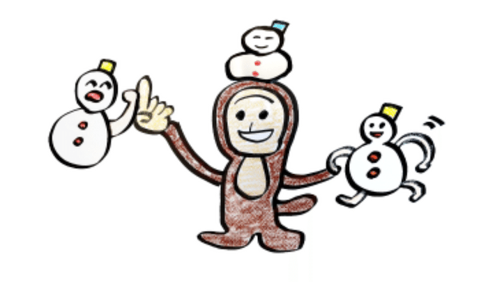 HBCのキャラクター「もんすけ」と雪だるまたちが遊んでいるようですね。