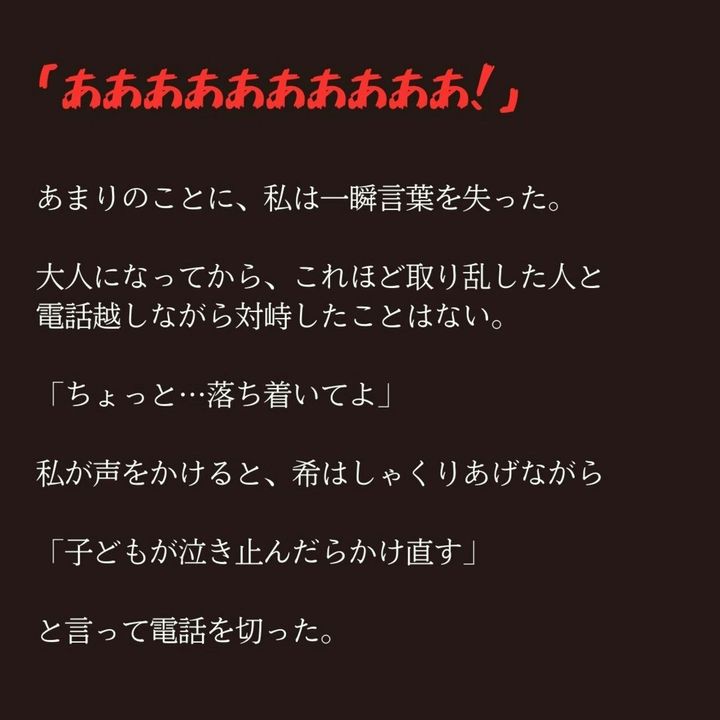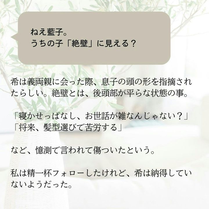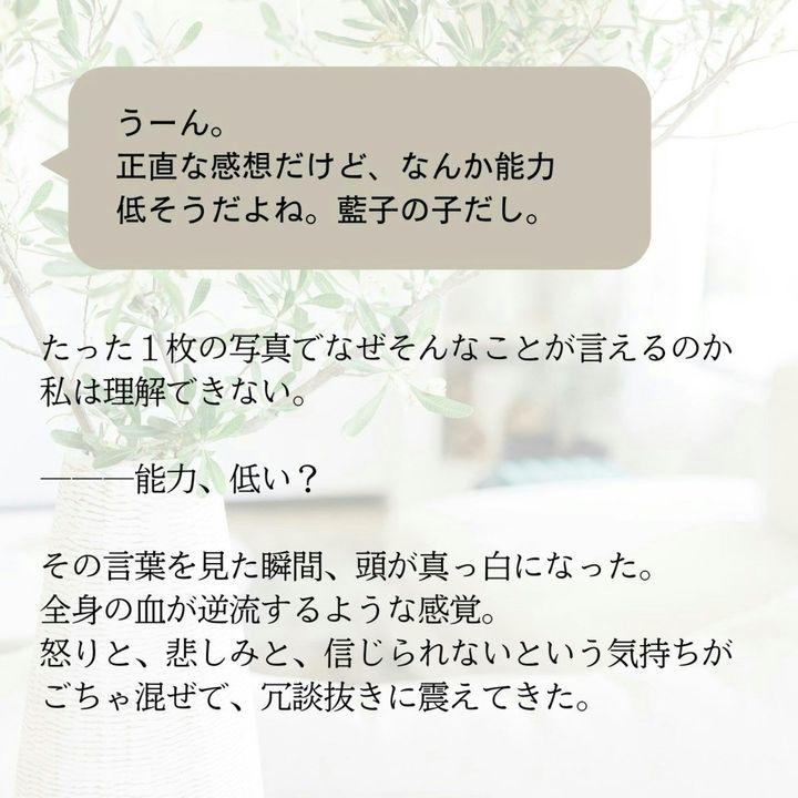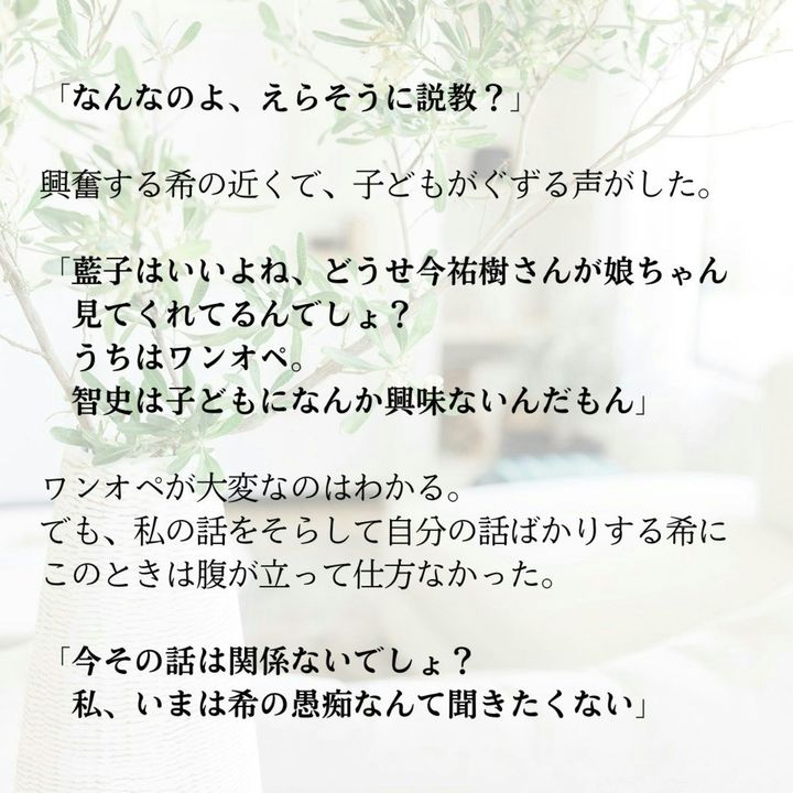藍子も希も1児の母となり、お互いに子育ての話で連絡を取り合うことがありました。そんなある日、1枚の写真がきっかけで、藍子は希にショックなことを言われます…。