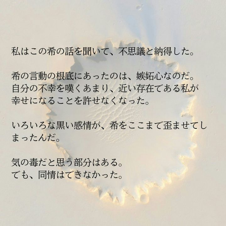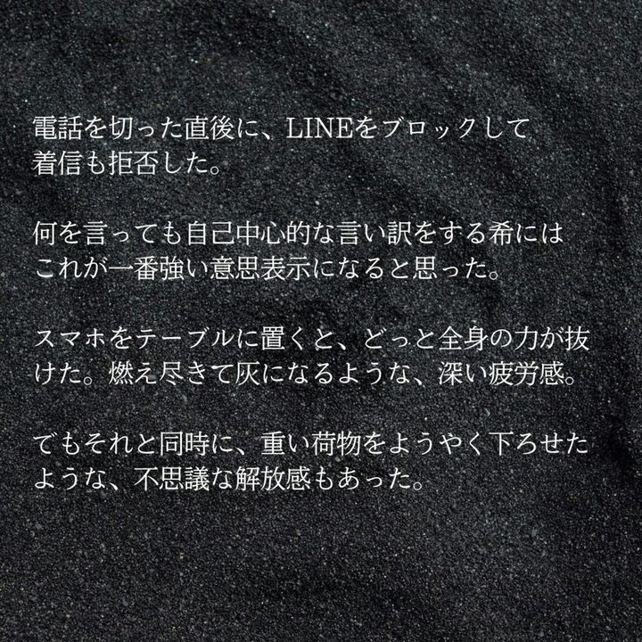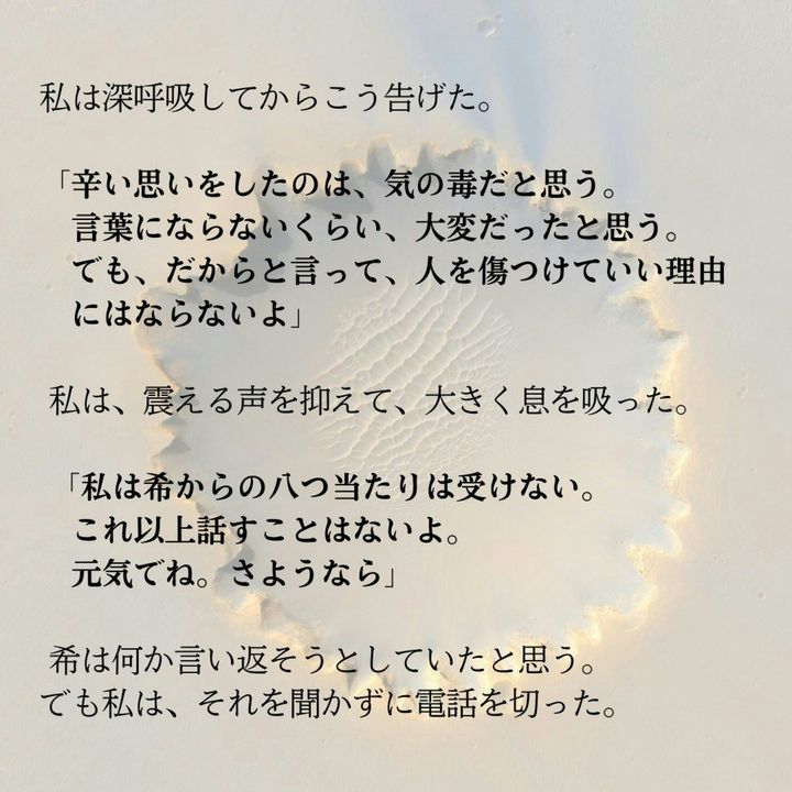 ついに、藍子は希との関係を断ち切ることができました。さみしさや虚しさもあったかと思いますが、解放感のほうが大きかったようですね。これで、もう希の言動に振り回されることがなくなりますね。