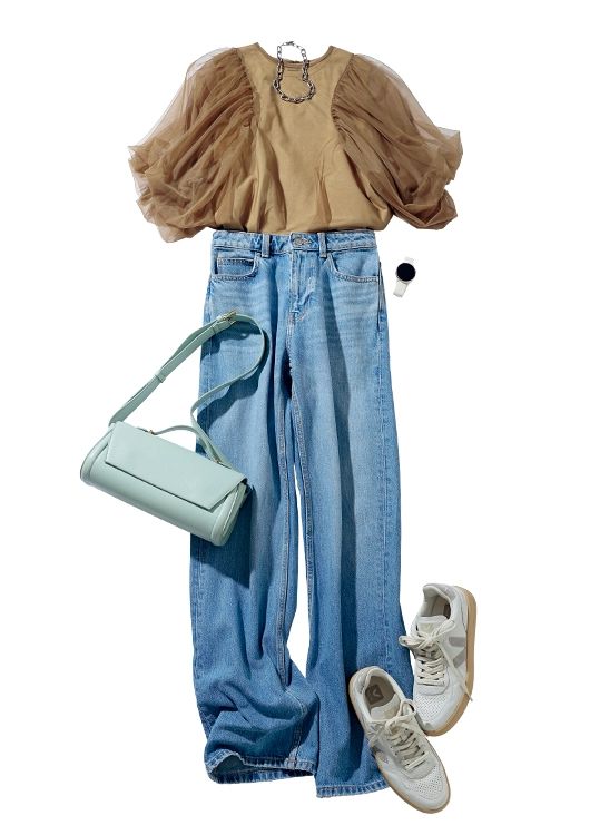 レイヤードTシャツ¥9,900/ミラ オーウェン ルミネ新宿2店 デニムパンツ¥6,590/ZARA(ザラ) 横長バッグ¥8,250/カカトゥ(アンビリオン) スニーカー¥31,900/ヴェジャ(シードコーポレーション) チェーンネックレス¥19,800/ステラハリウッド スマートウォッチvivoactive 6 ¥52,800/ガーミン
