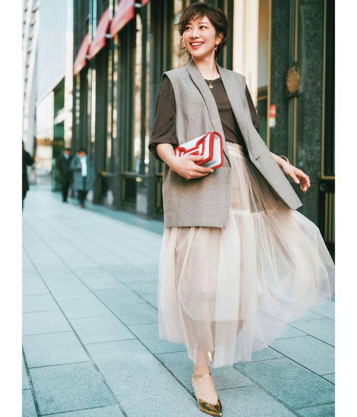 どんよりとした天気に気持ちまでよどみそうな日はパッと映える甘アイテムに頼って。風をはらんでふんわり広がるチュールスカートに心も軽く。ジレできりりと引き締めて、“大人可愛い”を満喫してリフレッシュ!