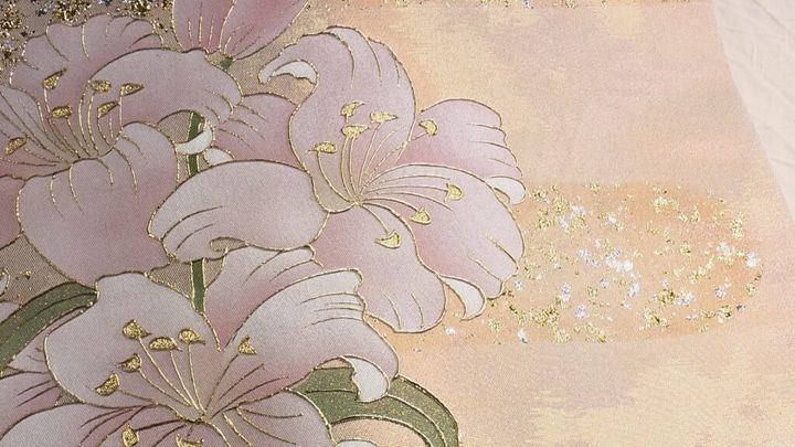 母の京子さんは18歳で京友禅の工房に入り、技術を習得。着物のリペア技術の高さにも定評があります。経年劣化による色褪せや箔の剥がれといった様々な状況にも経験と熟練の技で対応。金彩で着物の魅力をよみがえらせています。