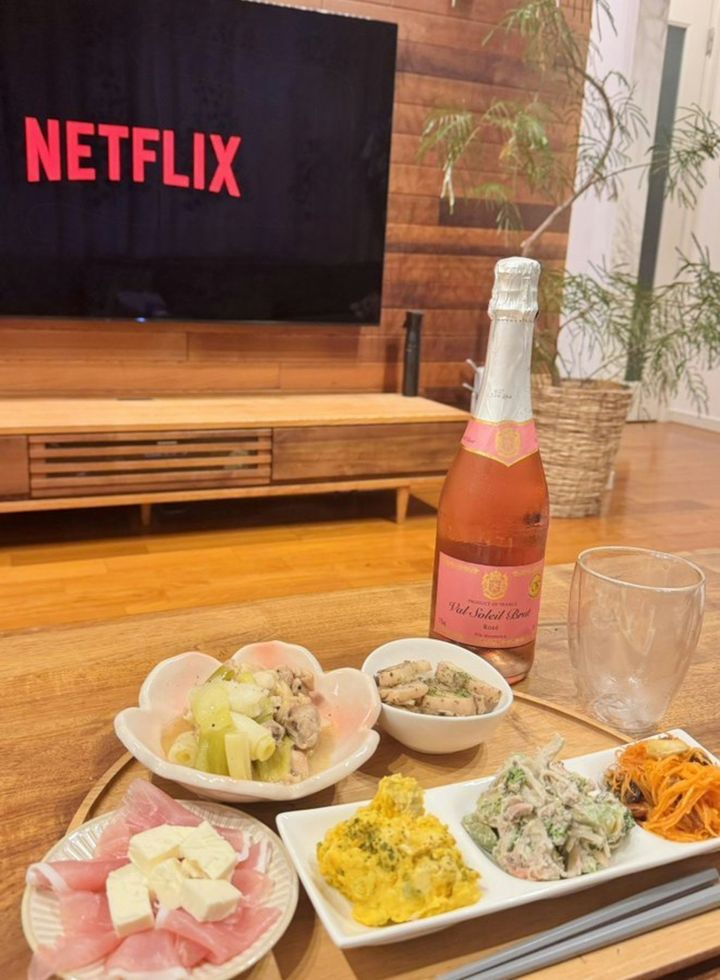 目の前のテレビにNetflixをつけ、色とりどりのおつまみで乾杯!日々が忙しいからこそ、こういった静かなひとり時間は身に染みますね。おつまみや飲み物も自分用なので好きなものを、見た目を気にせず、好きな物を見て、食べて、飲む…これほど幸せなことはありません。
