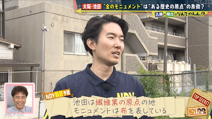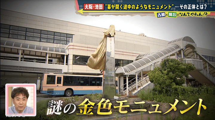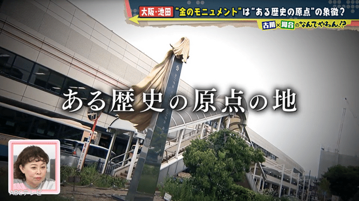 謎のモニュメントは、幕が開く途中のようなデザインだ。実物を見たタレントの河合郁人とABCテレビの古川昌希アナウンサーによると、「マントのようにも見える」という。池田といえば、世界初のインスタントラーメン「チキンラーメン」発祥の地として有名なため、「箸かフォークで(麺を)上げている瞬間なんじゃない!?」という考えも河合から飛び出た。
