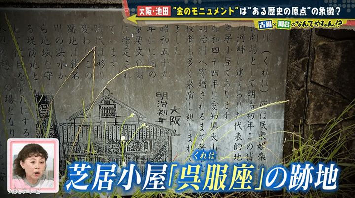 その後に河合と古川アナは、猪名川に架かる呉服(くれは)橋と、芝居小屋・呉服座の跡地の石碑を発見。古川アナは、「池田はお芝居の発祥の地で、あのモニュメントは、芝居小屋の緞帳を表している」と推測したが、河合から「呉服って漢字を使っているのは、元々そういう場所だったからじゃない?」と指摘され、考えを改めることに。最終的に2人は、「池田は繊維業の原点の地。モニュメントは布を表している」と考えをまとめた。