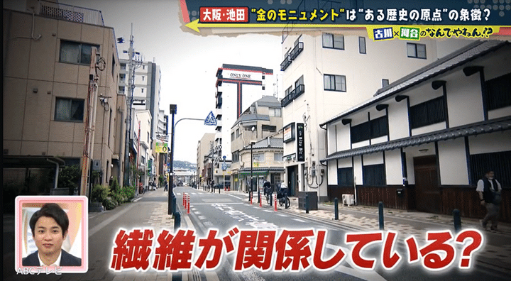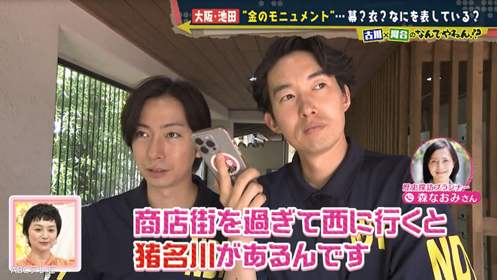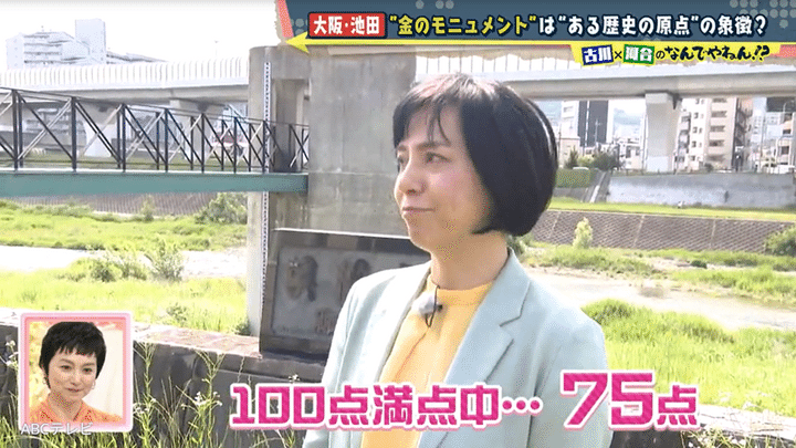 大阪の歴史に詳しい歴史探訪プランナー・森なおみさんいわく、「池田は“あるもの”の歴史の原点の地」であり、謎のモニュメントはそれを象徴しているとのこと。さらに森さんは河合と古川アナへ、「商店街を過ぎて西に行くと猪名川があるんです。その川までにヒントがある」とアドバイスした。