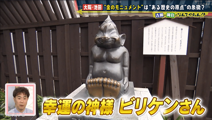 森さんのアドバイス通り、河合と古川アナが西にある商店街へ向かうと、大阪のシンボルである幸福の神様・ビリケンさんの像があった。ビリケンさんを商標登録したのは、池田市出身で繊維商社・田村駒の創業者だ。さらに河合と古川アナは、像の近くで繊維関係の店を数多く見かけ、謎のモニュメントのデザイン=布と考えた。