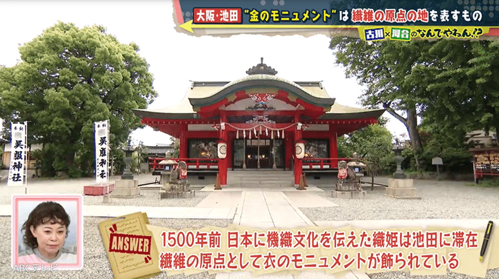 自信満々な河合と古川アナの推理は、100点満点中……75点となんとも微妙! 呉服や繊維に注目できたのは良かったが、2人に森さんがたどり着いてほしかったのは、池田駅の西側にある呉服(くれは)神社だ。ここは、繊維の祖神・呉服大神(くれはおおかみ)を祀る由緒ある神社である。
