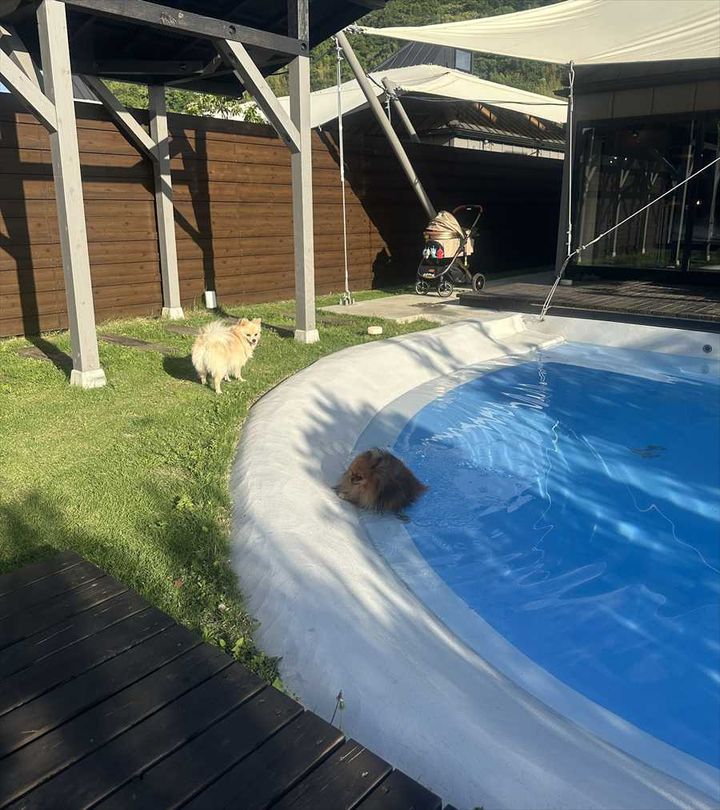 プールに落ちてしまっているのは、ポメラニアンの『ミルモ』くん。 宿泊施設のスタッフさんに注意されたにもかかわらず、そのすぐ後にプールに落ちてしまったそうです・・・。