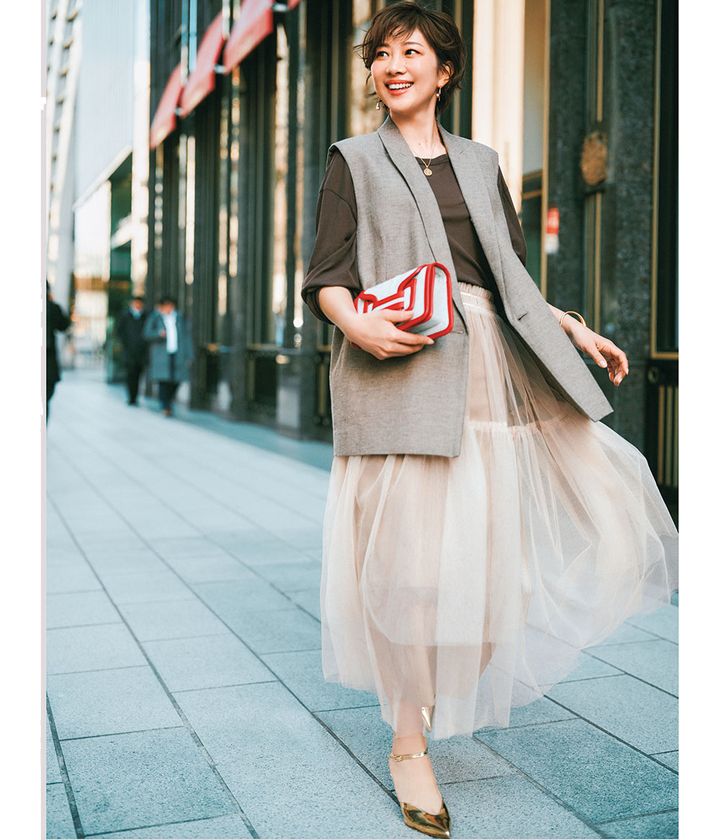 ジレ¥53,900(サクラ/インターリブ)Tシャツ¥16,500(セント ジョンズ サード クラブ/アマン)チュールスカート¥19,800(メゾンスペシャル/メゾンスペシャル 青山店)バッグ¥157,300(ピエール アルディ/ピエール アルディ 東京)パンプス¥66,000(ネブローニ)ピアス¥32,560バングル¥32,670(ともにソコ/ズットホリック)ネックレス¥11,000(チビ・ジュエルズ/チビジュエルズ・ジャパン)