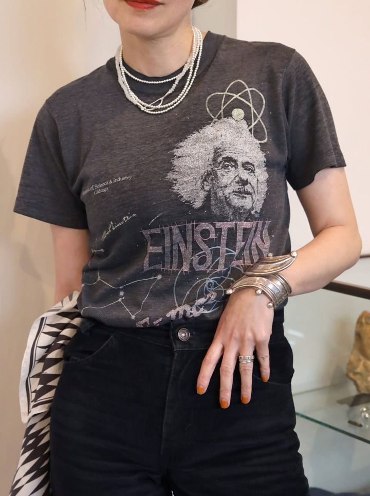 「80年代に発売していたSCREENSTARSのアインシュタインTシャツ。シカゴの科学博物館で売られていたものです。個人的にアインシュタインが大好きで、コットンが抜けた生地の柔らかい素材のものはなかなかないので気に入っています。近い将来、お店でアインシュタインのアイテムを集めたイベントができたらと考えています」ヴィンテージのSCREENSTARSのTシャツは本人私物