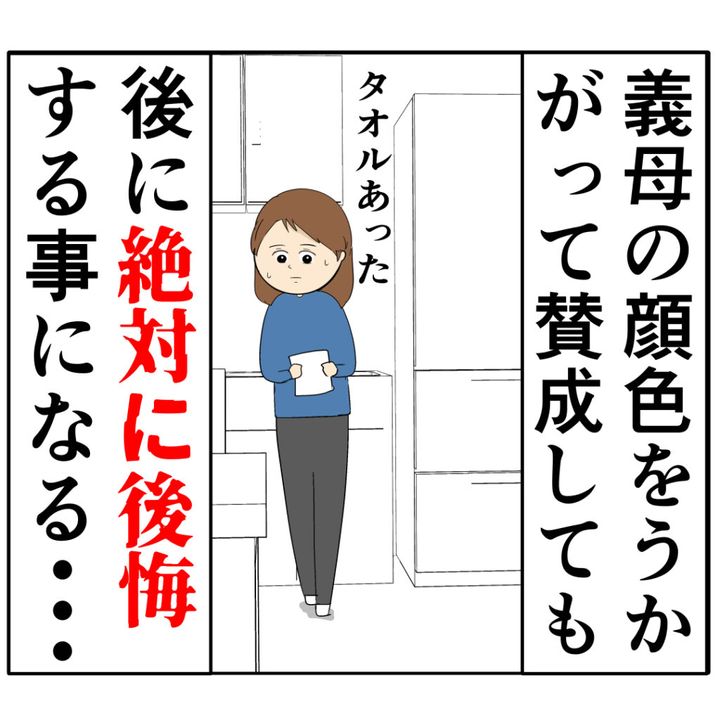 さくらさんはタオルを手に取り、義母のところへ向かいながら「義母の顔色をうかがって賛成しても、後に絶対に後悔することになる・・」と思いました。