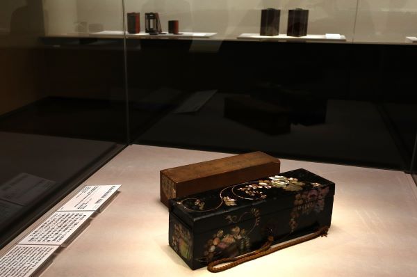 重要文化財《絵過去現在因果経(えかこげんざいいんがきょう)》(展示室1)が収納されていた《絵過去現在因果経 収納箱》。 蓋表には螺鈿で葡萄文様が繊細に施されています。当時流行していた朝鮮半島の螺鈿細工の影響が見られるそうです。