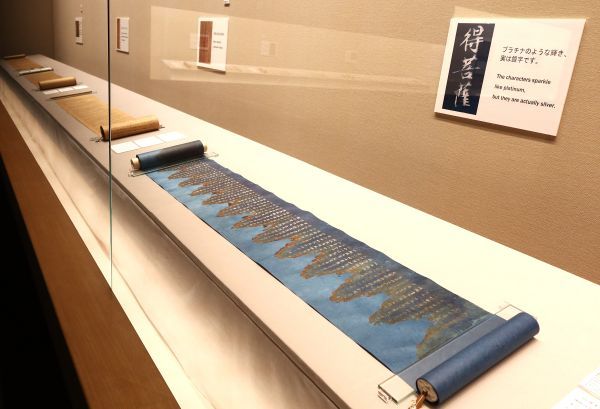 右、重要文化財 華厳経 巻第四十六(二月堂焼経) 1巻 紺紙銀字 日本・奈良時代 8世紀 根津美術館蔵