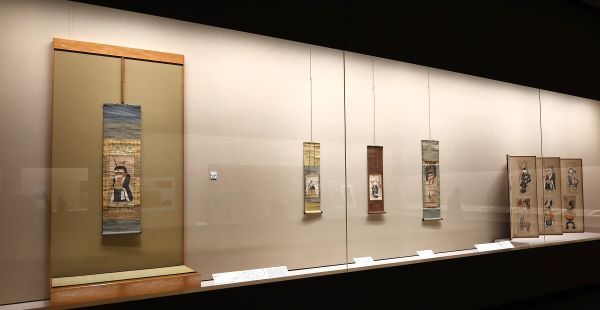 左、鬼の念仏 1幅 紙本着色 日本・江戸時代 18世紀ほか、「大津絵 つくられ方・たのしみ方」展示風景 すべて根津美術館蔵