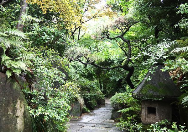 観覧の後は、庭園で散策。 庭園に出ると書のモノクロームの世界から、梅雨時の湿気を帯びた緑の艶やかさを感じさせてくれました。