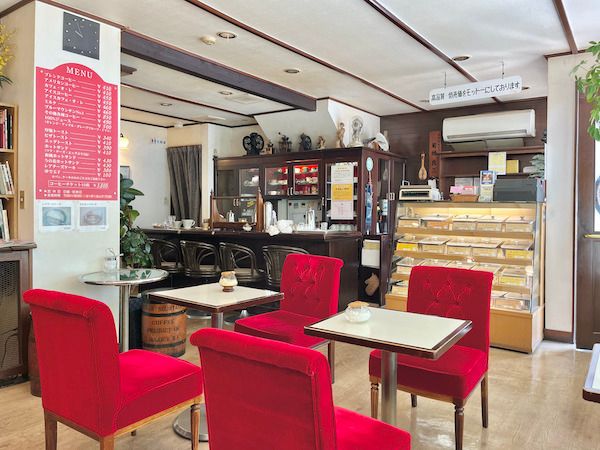 白を基調とした落ち着いた店内に赤いレトロな椅子が居心地の良い「菊地珈琲本店」。