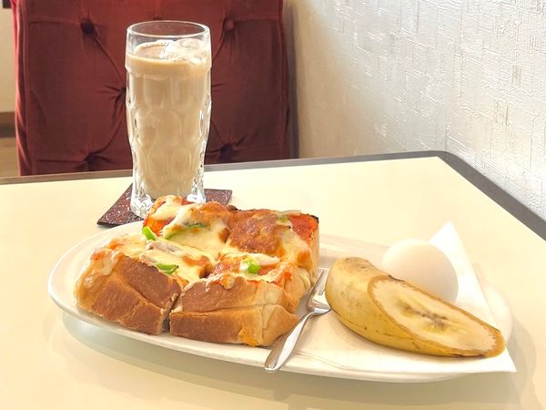 溢れるほどにチーズを載せたピザトースト、ゆで卵、バナナがワンプレートで410円。お財布に優しく、贅沢感たっぷり。