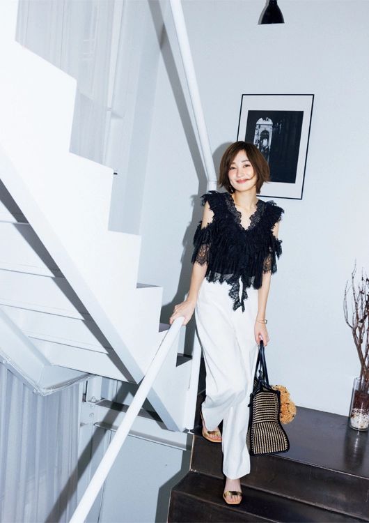 ブラウス¥18,920/FRAY I.D ルミネ新宿2店 パンツ¥22,000/MICA & DEAL(MICA & DEAL 恵比寿店) ピアス¥32,560/ソコ(ズットホリック) バングル¥4,860/アビステ バッグ¥64,900/ジャンニ キアリーニ(ジャンニ キアリーニ 銀座店) サンダル¥13,900/CHARLES & KEITH JAPAN