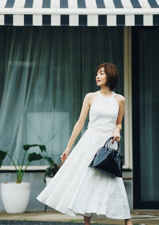 爽やかなオールホワイトを黒小物で凛と美人顔に