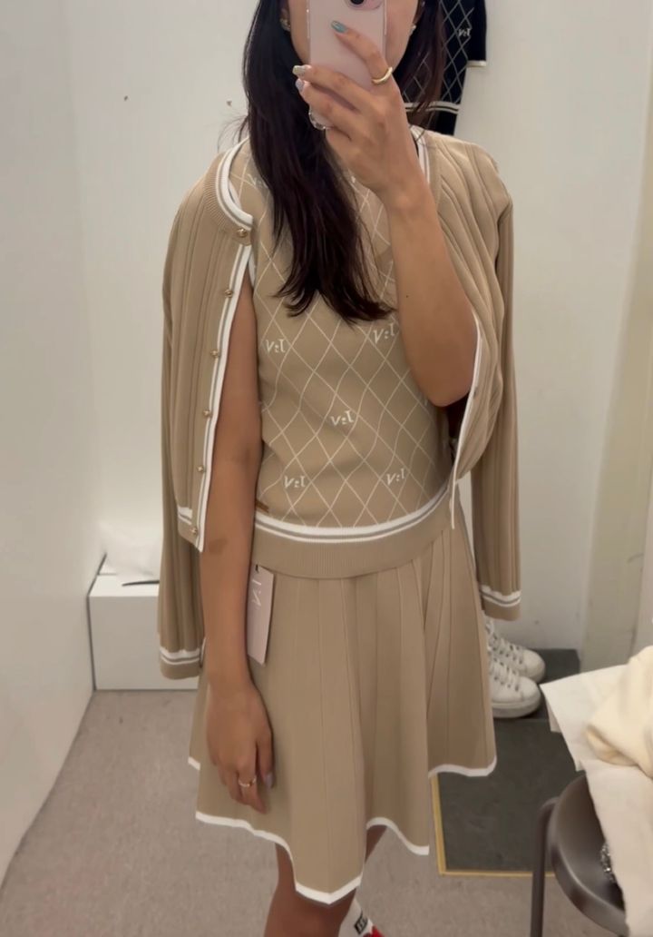 カーディガンと、ノースリーブニット、プリーツスカートの組み合わせが上品✨