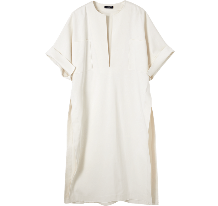脇に大きく入ったスリットを生かして、パンツやスカートを中に重ねて。カフタンドレス¥64,900(イレーヴ)