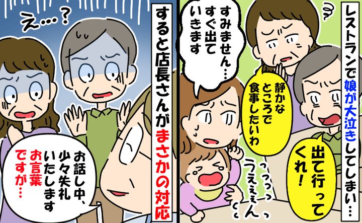 私を責めていた2人は店長さんに「子どもがずっと泣いていて、うるさくてかなわない。早く追い出してくれ」と口々に言いますが、店長さんはそんな2人を制止。「お言葉ですが、当店では年齢や性別に関わらず、すべてのお客様にお食事をお楽しみいただきたいと考えております。小さなお子様連れのお客様も、大歓迎です。ほかのお客様に対する過度な指摘は、お控え願います」と2人に言いました。さらに隣の席の男性には「お子様の泣き声が気になるようでしたら、奥の個室にご案内いたします」と言い、女性には「お料理をお持ち帰りいただいて、ご自宅でゆっくりとお召し上がりいただくことも可能です。また、昼過ぎや夕方ごろなど、比較的お客様が少ない時間でのご来店もおすすめいたします」と続けます。
