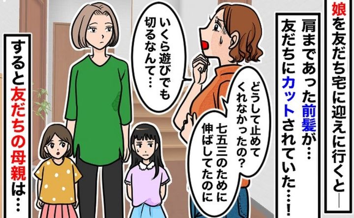 お友だちの家に遊びに行った小1の娘を迎えに行った際、驚くべき光景が待っていました。お友だちと「美容院ごっこ」をしていた娘。「カットのマネ」という約束のはずが、肩まであった娘の前髪が眉毛の上までカットされていたのです。そしてママ友の言葉に、私はあ然としてしまいました……。