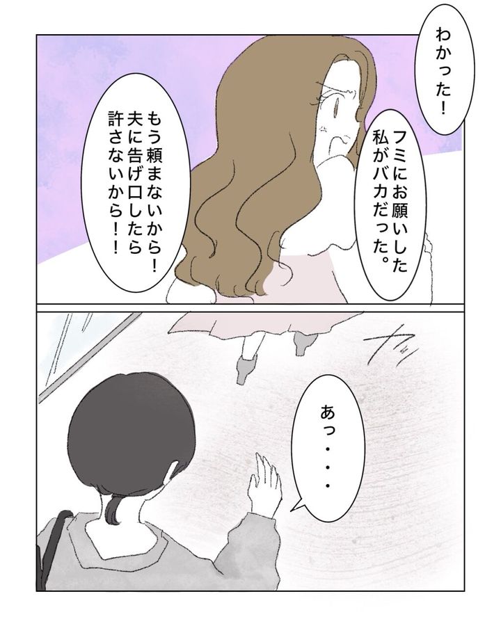 すると、「わかった!フミにお願いした私がバカだった。もう頼まないから!夫に告げ口したら許さないから!!」そう言い捨てて走り去り、「あっ・・」と呟くだけの私。