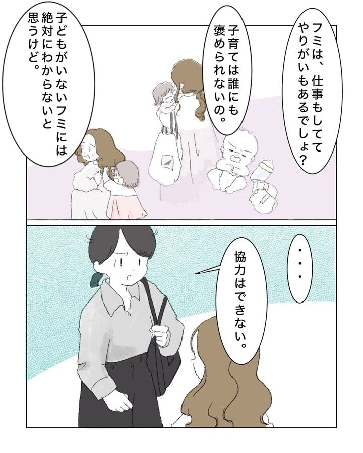 そして、「フミは、仕事もしててやりがいもあるでしょ?子育ては誰にも褒められないの。子どもがいないフミには絶対にわからないと思うけど」そう言って協力をせがむアンナに、「・・協力はできない」とキッパリ伝えたフミさん。