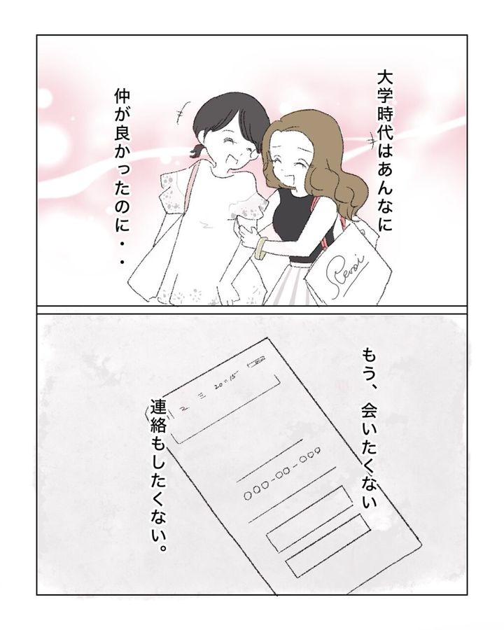 「大学時代はあんなに仲が良かったのに・・。もう、会いたくない。連絡もしたくない」と心の中で呟くのでした。