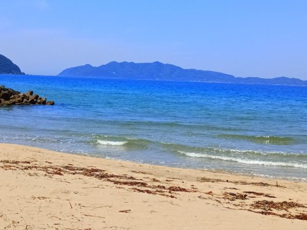 『プライドポテト 日本の神業 九州焼のり醤油』と好きなドリンクをもって、海を見に来ました。 グラデーションがとってもきれいで、大島や地島が見えます。